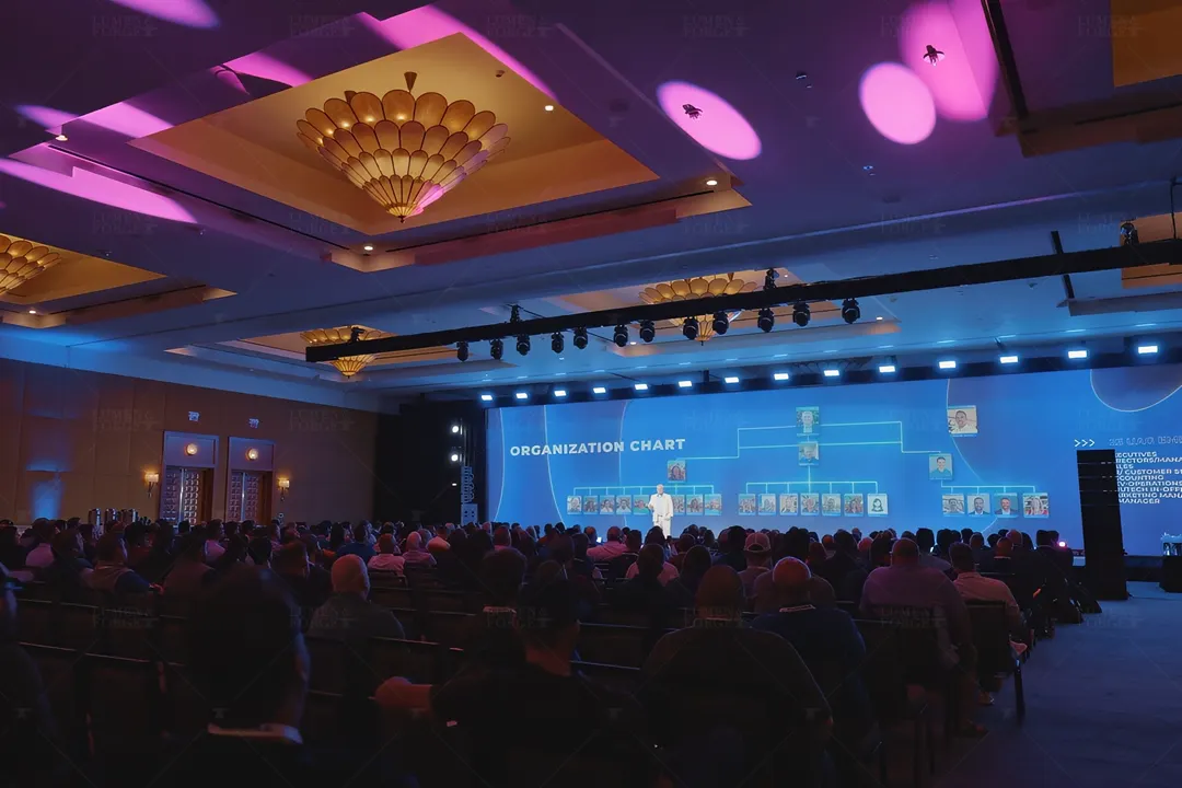 For the CEO’s annual address and the Awards Dinner Gala, we implemented a sophisticated, shadowless rear-projection system that served as a visually striking backdrop for the main stage.